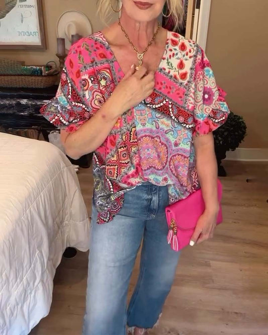 Lässige bedruckte Kurzarm-Rüschenbluse mit V-Ausschnitt