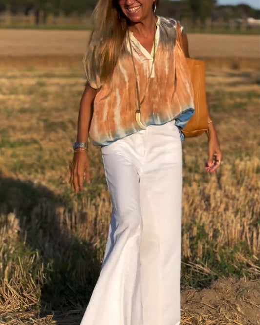 Lässige bedruckte V-Ausschnitt Kurzarmbluse