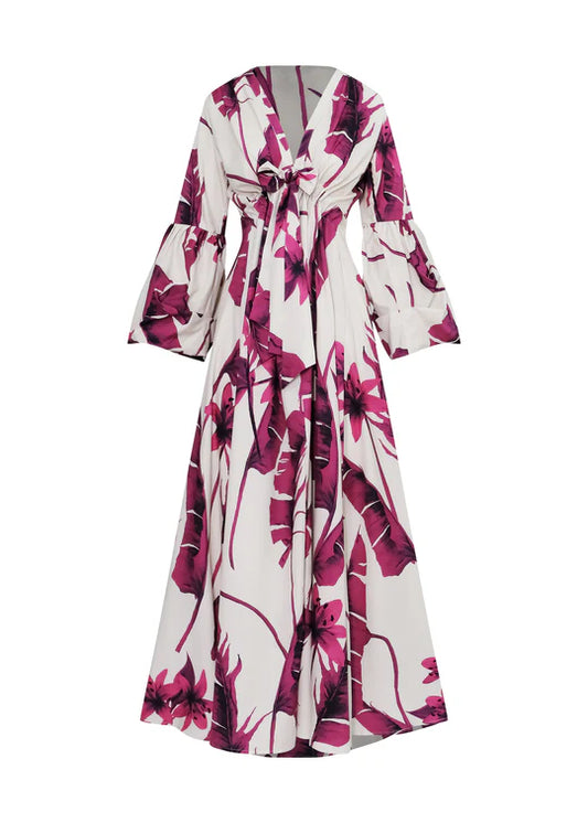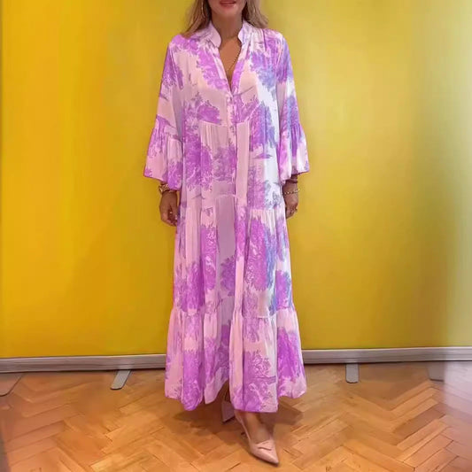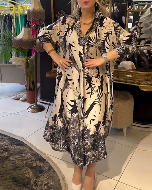 Bedrucktes, lockeres Kleid mit Glockenärmeln und V-Ausschnitt