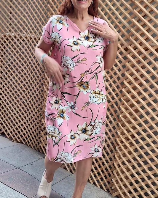 Kurzärmliges Kleid mit Blumendruck und V-Ausschnitt