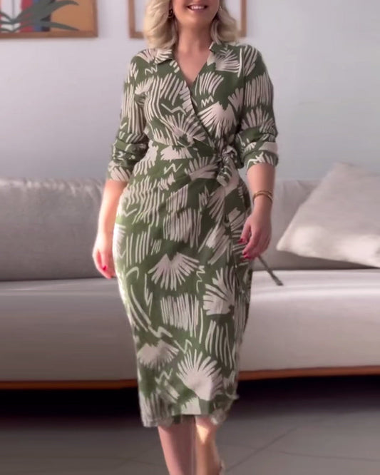 Elegantes Midikleid mit Blättermuster und Revers-Schnitt