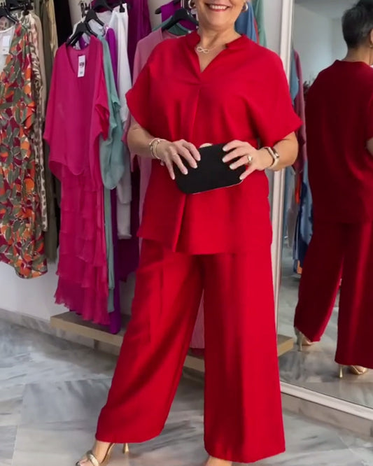 Zweiteiliger Anzug in Unifarbe mit V-Ausschnitt und weitem Bein