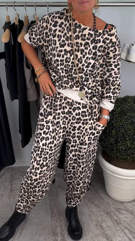 Freizeitanzug für Damen mit Rundhalsausschnitt, langen Ärmeln und Leopardenmuster