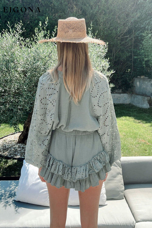 Nebelgrünes, gekräuseltes Shorts-Set mit Raglanärmeln und Ösen