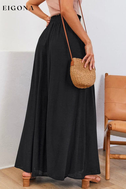 Schwarze, gesmokte Hose mit weitem Bein und hohem Bund und Kordelzug