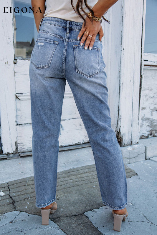 Himmelblaue, lockere Jeans mit geradem Bein und ausgefranstem Saum und Löchern im Distressed-Look