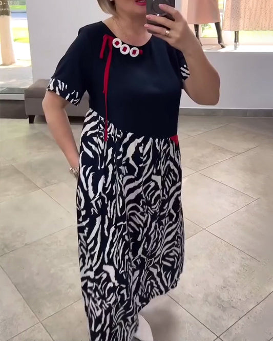 Lockeres Patchwork-Kleid mit Farbdruck und Rundhalsausschnitt