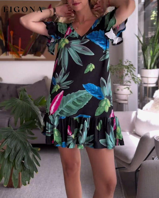 Lässiges bedrucktes Kurzarmkleid mit V-Ausschnitt