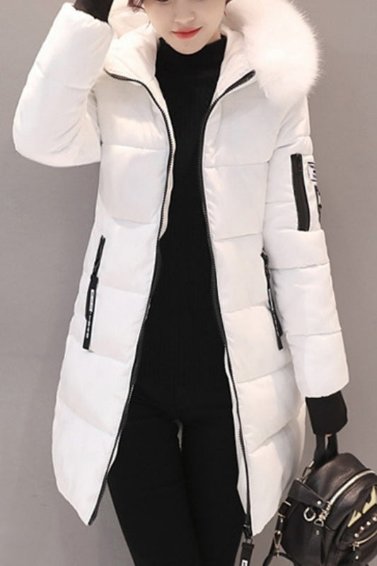 Lässiger Baumwollmantel für Damen mit glänzendem Pelzkragen und Kapuze