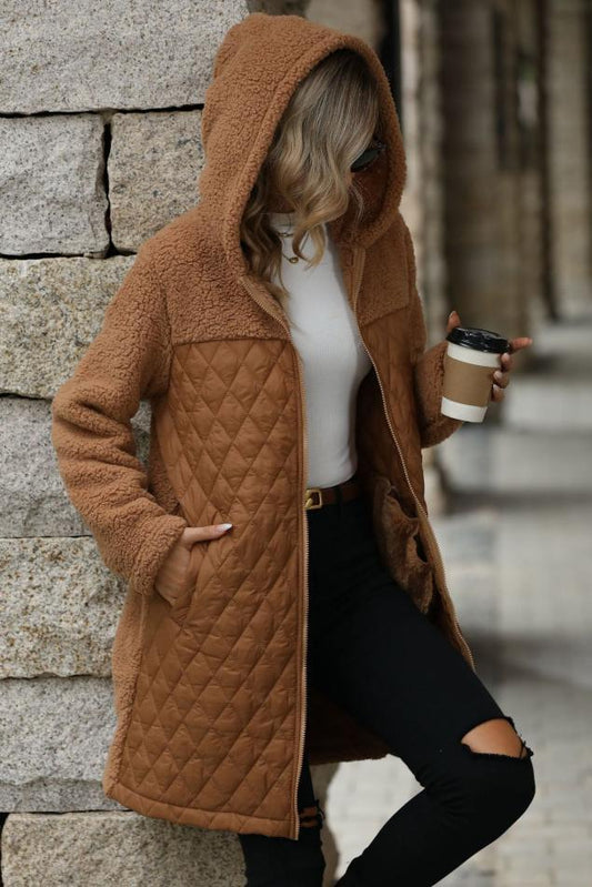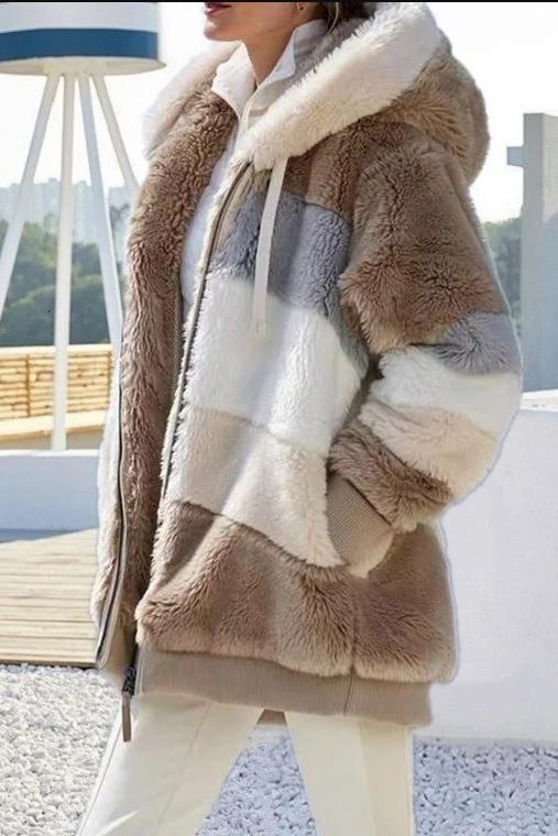 Lockerer Plüschmantel mit Kapuze und Reißverschluss für Damen