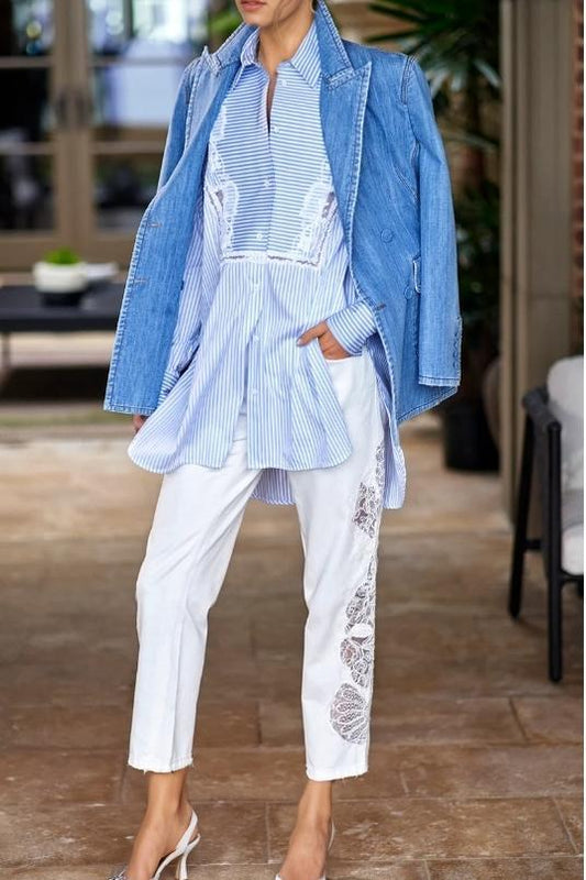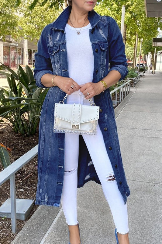 Langer Denim-Trenchcoat, zerrissene Jeansjacke