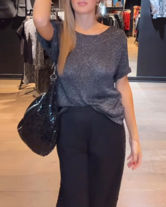 Pullover aus glänzender Seide mit Rundhalsausschnitt und halblangen Ärmeln
