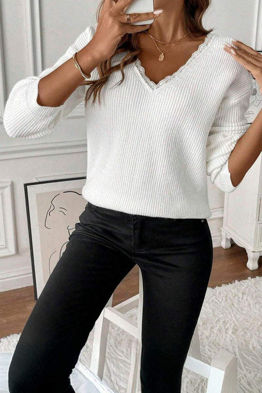 Damenpullover mit V-Ausschnitt und Patchwork-Spitze
