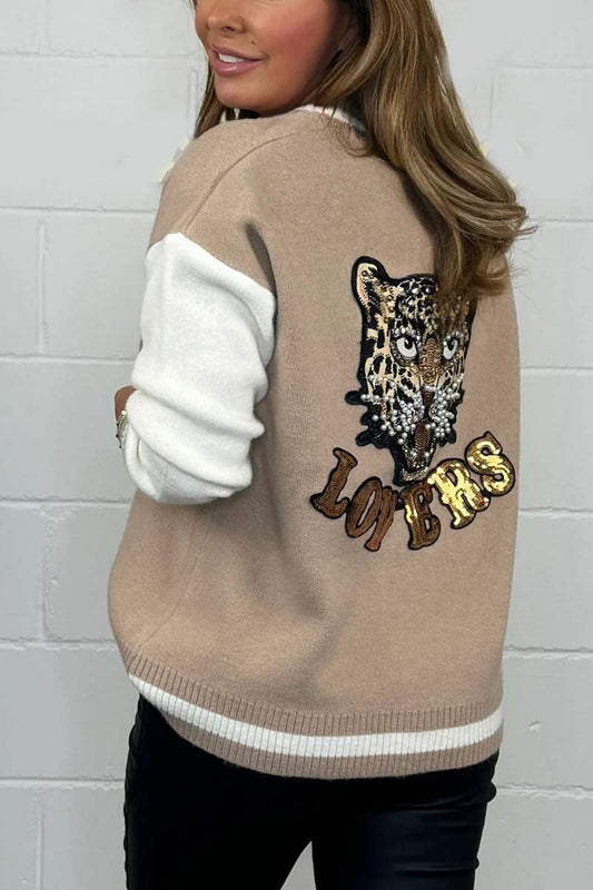 Damen-Cardigan im Baseball-Stil mit Geparden-Paillettendetail in Kamel und Creme