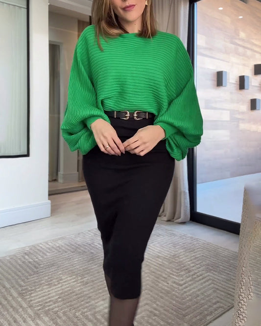 Solid color lantern sleeve ribbed sweater