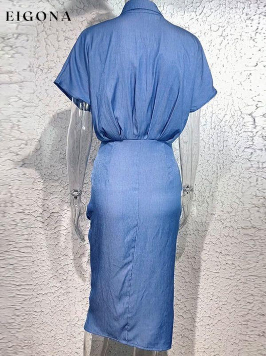 Women's Denim Button Down Short Sleeve Ruched Waist Tie Shirtdress