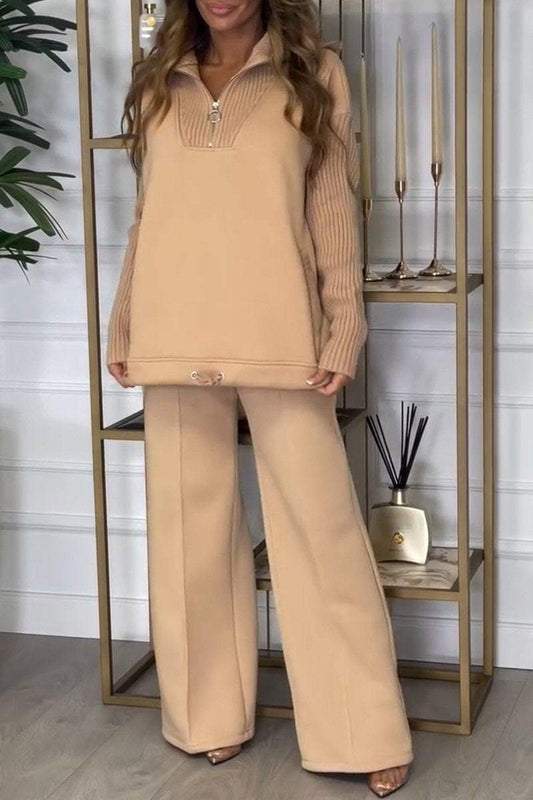 Women's Pleated Fabric Lapel Top and Pants Two-piece Set