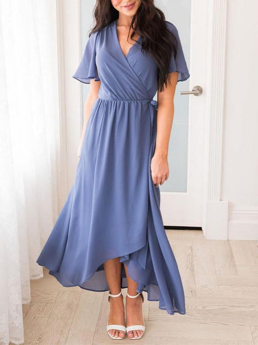 Women's V-neck Solid Color Short-sleeved Irregular Dress