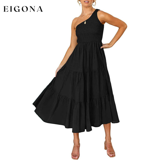 Womens One Shoulder Sleeveless Smocked Ruffle Tiered Beach Long Midi Dress