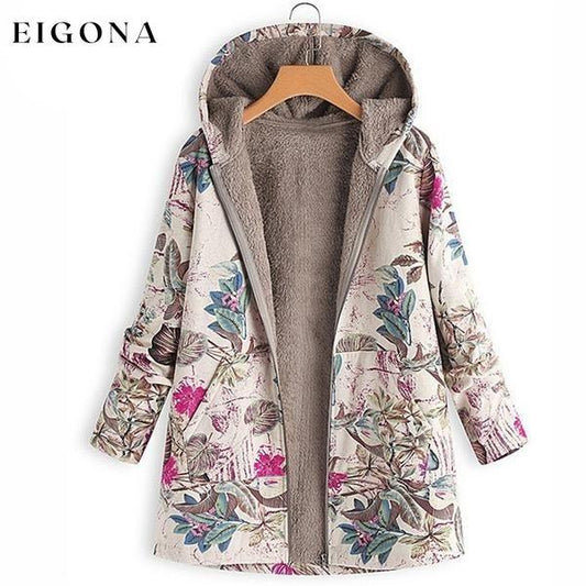 Women's Fashion Leaves Floral Print Fluffy Fur Hooded Long Sleeve Vintage Casual Coat