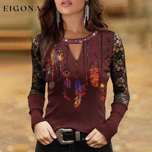 Ladies Fashion Retro Lace Stitching Printed Long Sleeve Top