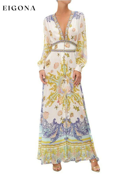 New elegant V-neck long-sleeved positioning printed holiday dress