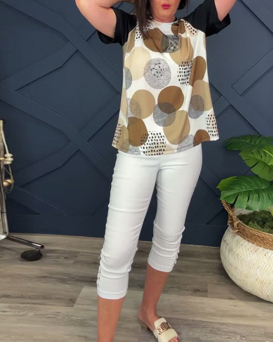 Polka dot print round neck short-sleeve casual T-shirt