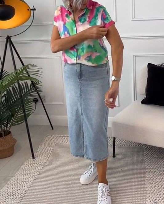 Colorful printed lapel button short sleeve shirt