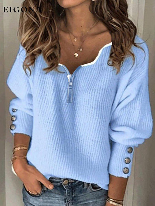 Women's Solid V-Neck Zip Knit Loose Long Sleeve T-Shirt