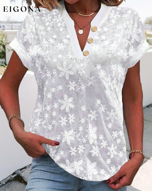 Loose V-neck Embroidered Top with Buttons