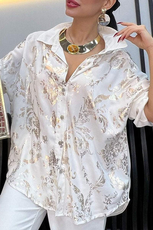 Women's Lapel Mid-length Sleeve Gold-stamped Casual Shirt