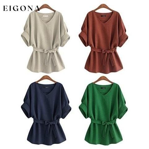 Linen-Blend Loose-Cut Casual Short Sleeve Top with Belt