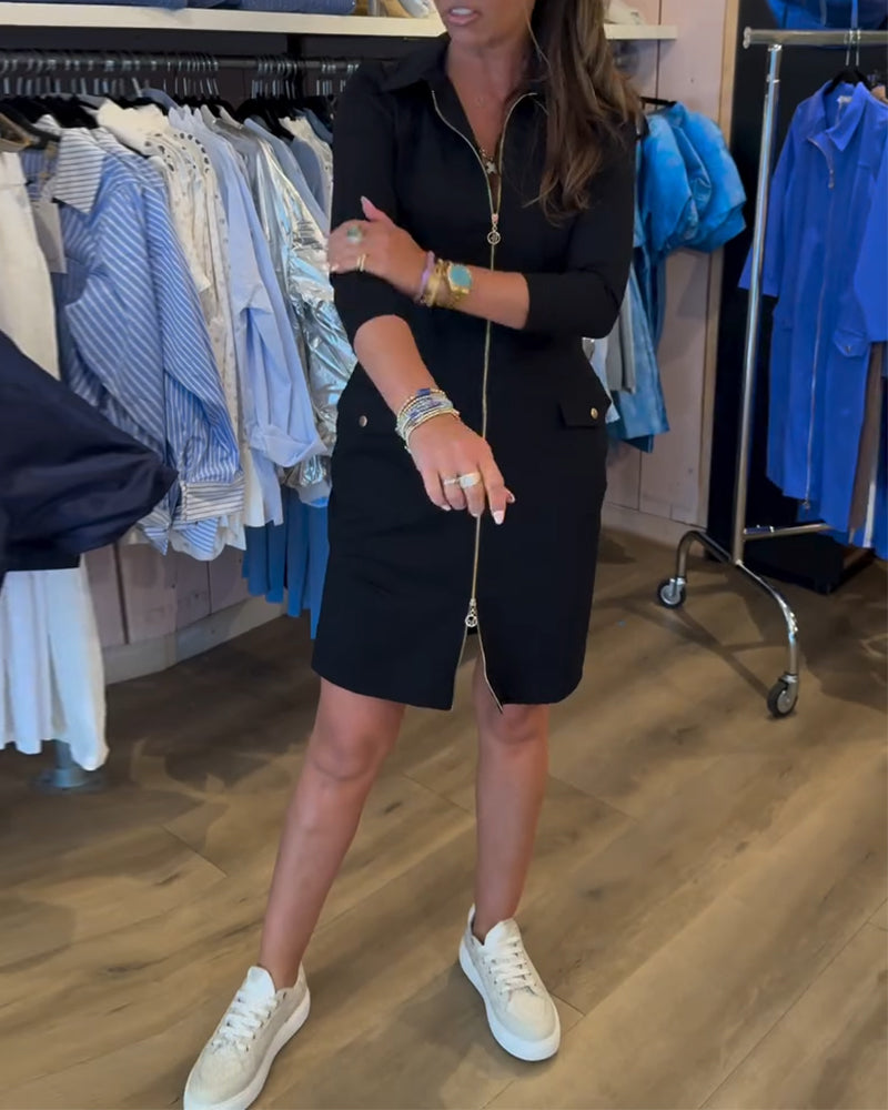 Lapel Solid Color Zipper Long Sleeve Dress