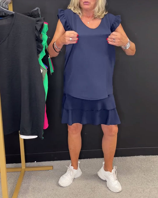 Traje simple de dos piezas con volantes de color sólido