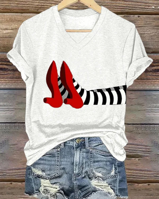 Camiseta casual estampada con zapatos rojos de Halloween para mujer