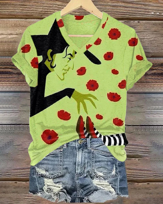 Lässiges Halloween-T-Shirt mit V-Ausschnitt und Leopardenmuster für Damen