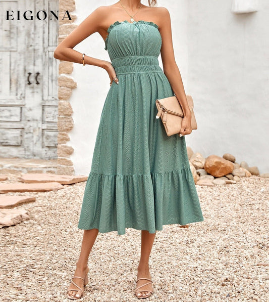 Vestido midi sin tirantes con ribete de volantes