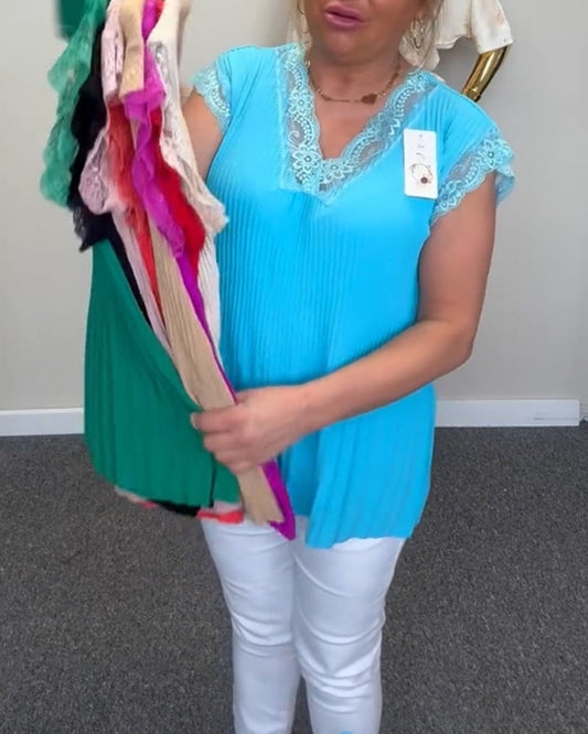 Elegante blusa de encaje con cuello en V, sin mangas, de color liso
