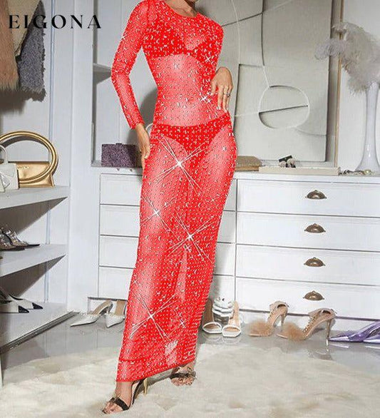 Vestido de falda larga de manga larga de malla de color sólido para mujer a la moda