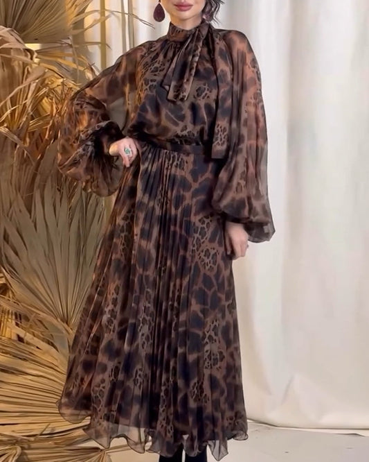 Plissiertes Kleid mit Ballonärmeln und Leopardenmuster