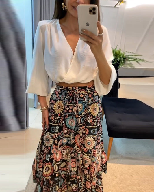 Ensemble deux pièces de tempérament de couleur unie à col en V