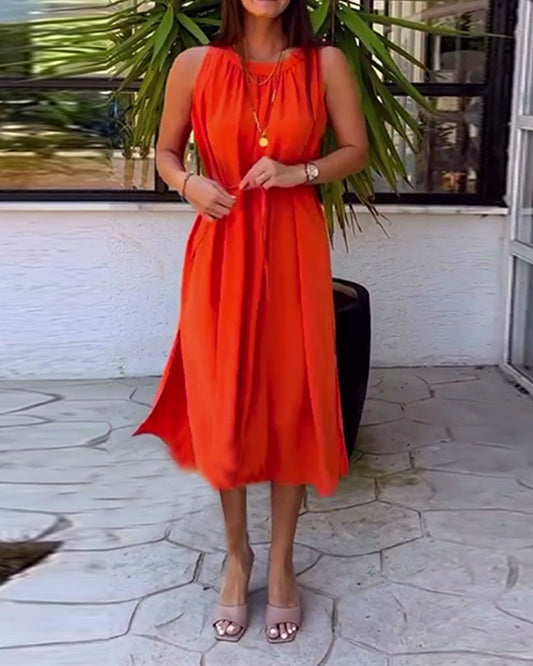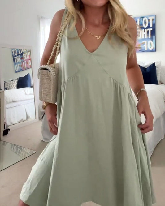 Lässiges, ärmelloses, einfarbiges Kleid mit V-Ausschnitt