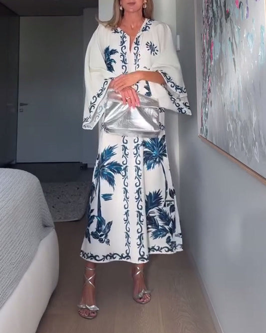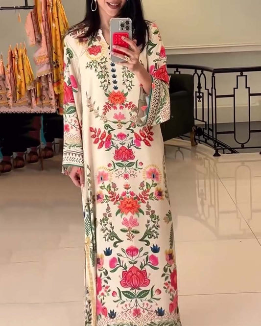 Elegantes bedrucktes Kleid mit V-Ausschnitt und langen Ärmeln
