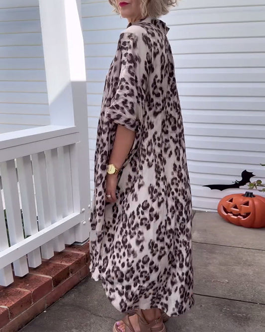 Lockeres Kleid mit halblangen Ärmeln und Stehkragen und Leopardenmuster