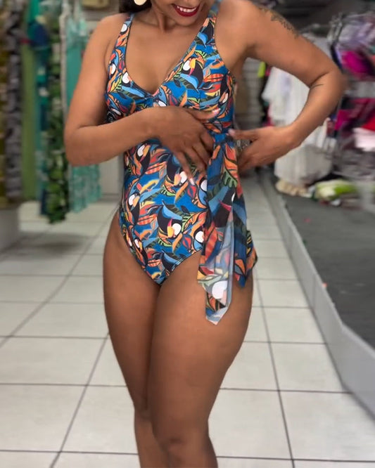 Einteiliger Badeanzug mit bunt bedrucktem Schlitzträger