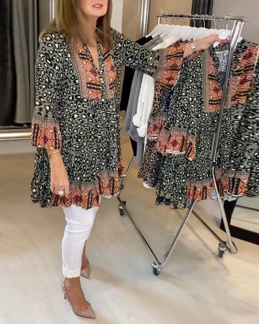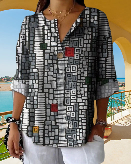 Blusa con bottoni a maniche lunghe e scollo a V con stampa vintage
