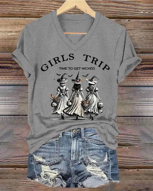 Maglietta casual con scollo a V, divertente per ragazze streghe di Halloween, tempo di diventare malvagie