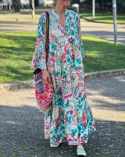 Abito lungo ampio con bottoni e scollo a V stampato