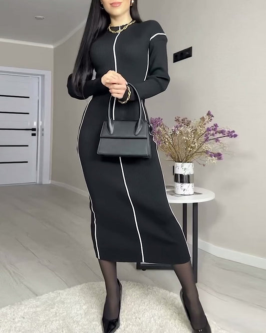 Abito in maglia aderente alla moda con colletto alto e maniche lunghe, patchwork