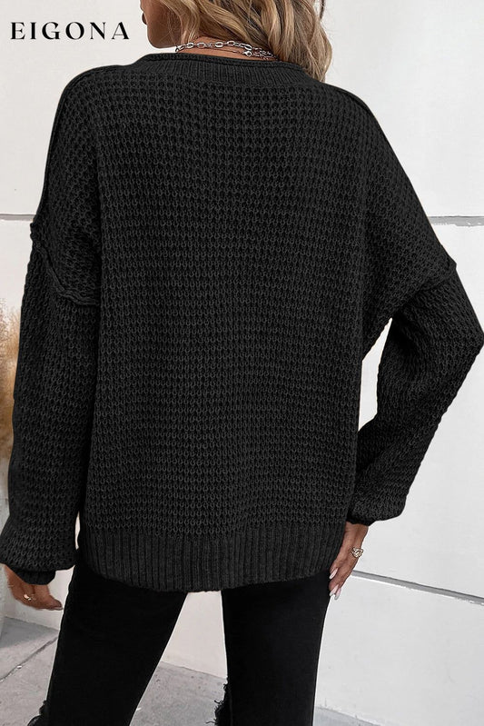 Svart Pointelle Knit Button V-hals Drop Shoulder Genser